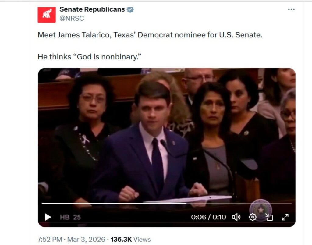 State Rep. JAMES TALARICO defeated J Crockett in Texas’s Democratic U.S. Sen. Primary, per the AP. Both parties expect a competitive general election in November. Republicans erupt, attacking Senate contender James Talarico after his declaration: “God is nonbinary.”